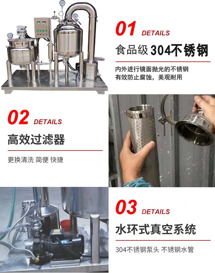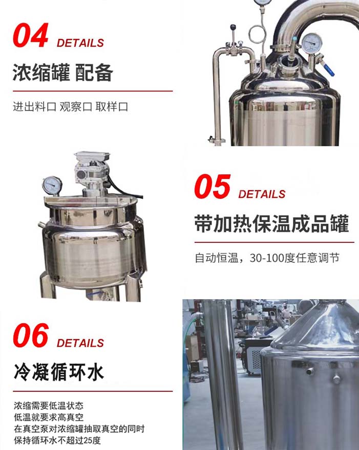 3 、預(yù)熱罐、濃縮罐的夾層內(nèi)加滿水,以防加熱器干燒;夾層出氣口嚴(yán)禁封閉;接好冷凝器的冷卻水管,冷卻水底進(jìn)高出。