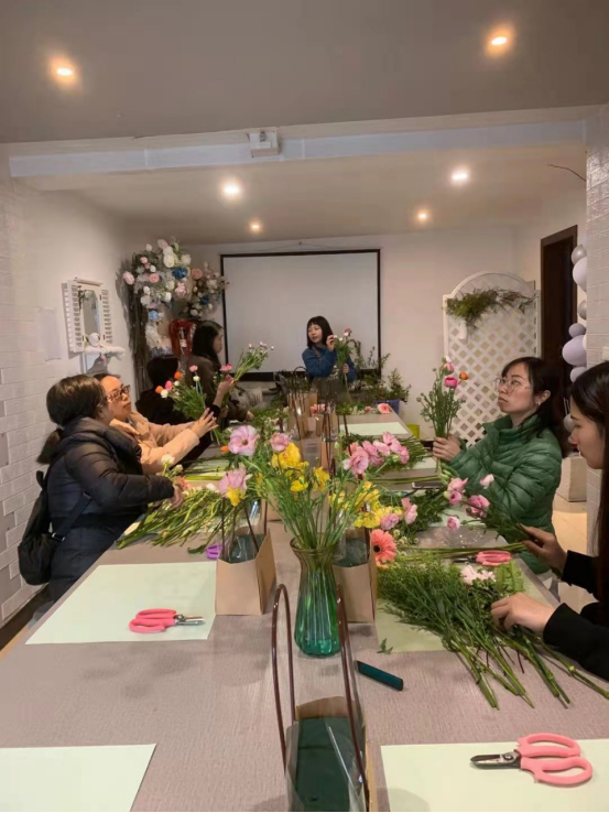 當小伙伴們看到桌子上鋪滿的各類花材,都迫不及待、躍躍欲試。大家一邊認真聽取花藝老師的講解,一邊對自己手中的花材進行修剪、搭配、造型,期間互相交流,忙得不亦樂乎
