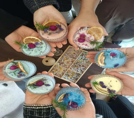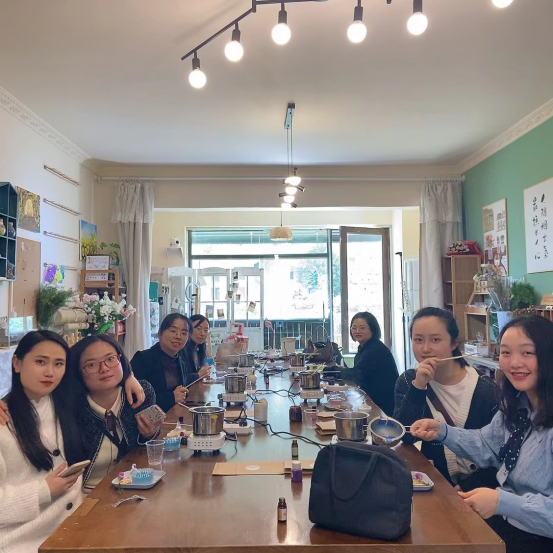 當(dāng)大家看到桌子上有各種材料及鍋具,十分好奇,都躍躍欲試?,F(xiàn)場(chǎng)由3位手工老師指導(dǎo)大家從香薰選擇、顏色搭配、最后到融蠟開(kāi)始。